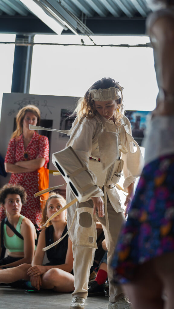Une danseuse déambule dans un espace ; son costume est muni de 2 haut-parleurs directionnels. La bande-son diffusée est nourrie par les SONS des alentours (préalablement choisis par des ateliers d’explorations sonores).